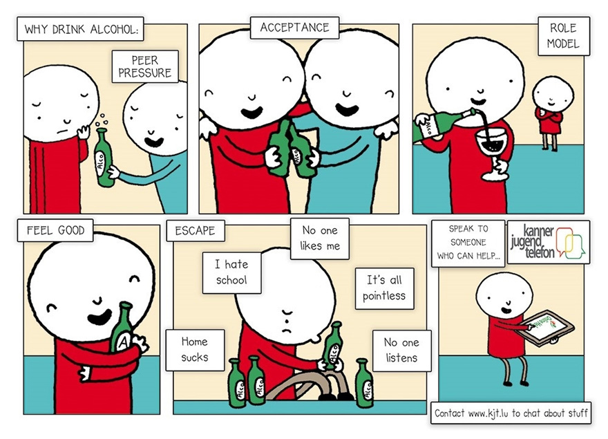 In Luxembourg, like many of it’s bordering countries, alcohol is used widely and is present at nearly all occasions from family celebrations at birth to school fêtes and business lunches to retirement parties. It is a socially acceptable drug that most people consider to be fairly harmless despite restrictions for it’s selling and consumption for children under the age of 16 years old. This is why children and young people can be confused by what they are being told about alcohol and what they experience in the adult world around them.