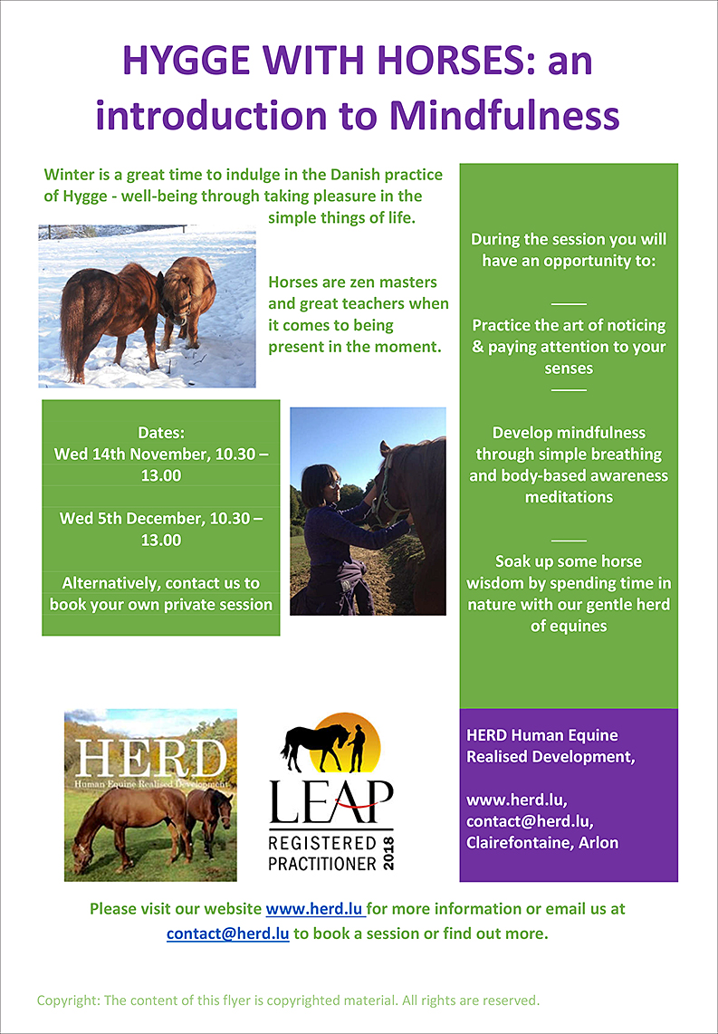 Kylie and Kate from HERD have released details of their latest group programme, which is a seasonal offering called “Hygge with Horses”. In a half-day session, you will practice the art of being present. Similarly you will develop the skills of noticing, paying attention and awareness through simple breathing and body-based awareness meditations. There will also be opportunity to soak up some horse wisdom by spending time in nature with their gentle herd of equines.