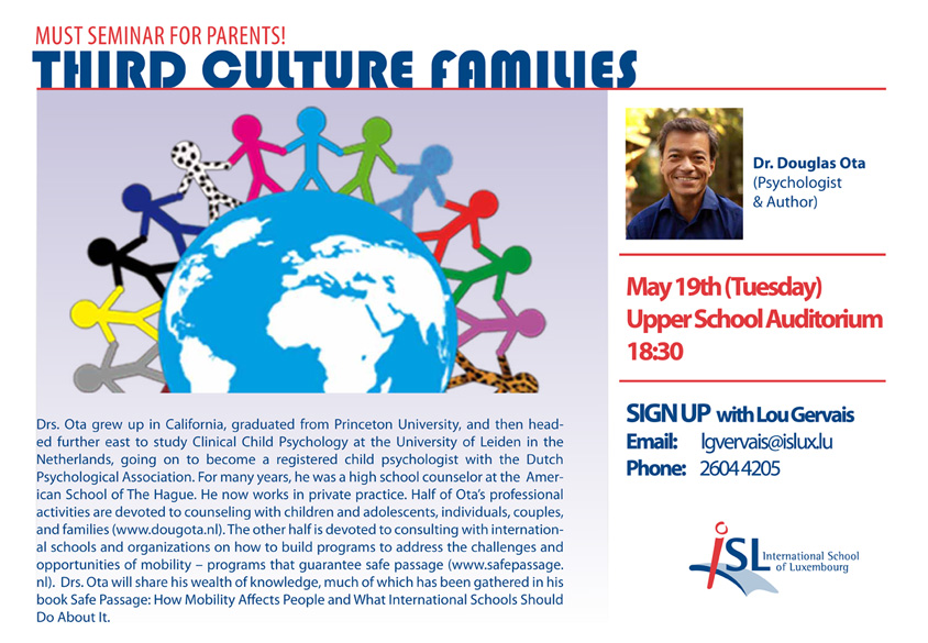 On Tuesday 19th May, the International School of Luxembourg (ISL) will be holding an evening parenting seminar entitled ‘Third Culture Families’.