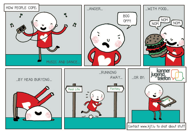 The KJT Online Help Service can support children, youths and their parents in English, German, French or Luxembourgish. The English Online Help service was launched in 2015 and is presently running a publicity campaign for young people in Luxembourg. The campaign mascot ‘Bod’ is touring schools and places where young people meet to distribute postcards to advertise this service. A new postcard will be published each month around a theme that affects children and young people. The general theme this month is ‘How people cope’. The campaign will run for 12 months, and there is a competition with prizes to find a letter hidden in each card that makes up a 12-letter word most important to this service.