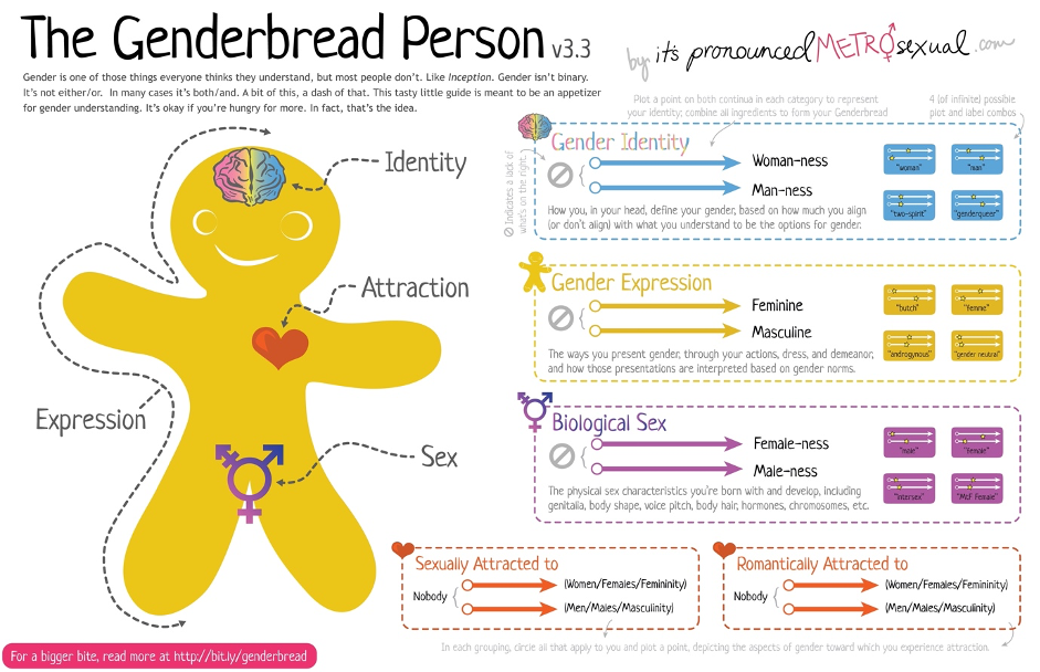Sexual orientation is more about whom we are attracted to in a sexual and non-sexual way as a partner. On this spectrum, Heterosexuals are attracted to the opposite sex or gender and Homosexuals are attracted to the same sex or gender. In between as you can see in the graphic a person can identify as Bi-sexual people who may feel attracted to two genders (“bi” meaning “two”) which does not automatically exclude transgender people and pansexual people who do not care about the person’s gender (“pan” meaning “all”). Sexual orientation also includes people who identify as Asexual and/or Aromantic. Asexual people may be romantically attracted to someone but they experience no or very little sexual attraction. Aromantic people may want to have sex but they are generally not interested in a romantic relationship