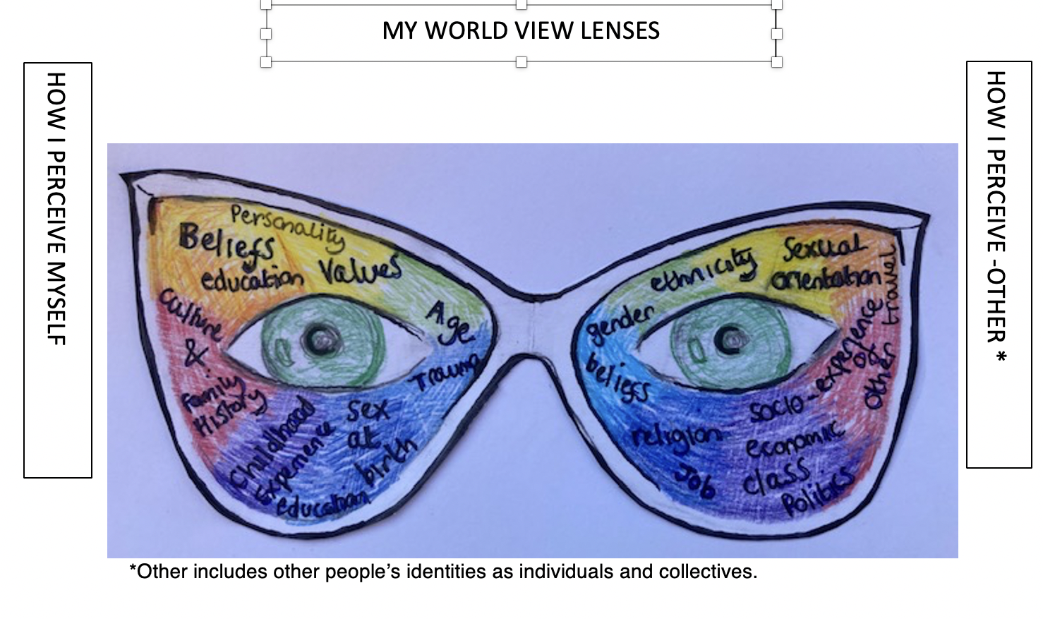 heir own view of these identities, and this is the attributed identity of the person. In this way, we can understand that the way we all perceive identity is dependent on the way we interpret the world through our own metaphorical lenses or our worldview. Which is unique and changing all the time with new information and experience. Problems arise when we do not recognize that everyone interprets their experience of the world through their own worldview lenses therefore no two people will have the same point of view. That is why we need to respect how other people identify themselves.